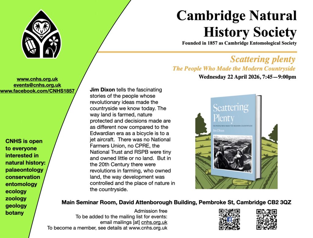 This term there is an extra talk in the Cambridge Natural History Society programme, on WEDNESDAY 22nd April at 7:45 p.m. in the David Attenborough Building.