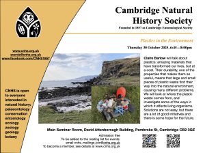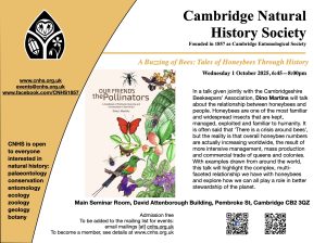 Cambridge Natural History Society have organised four talks, in addition to the joint event with the Cambridge Beekeepers’ Association, in October. These take place on Thursdays at 6:45 p.m. Please arrive punctually. Tea/coffee available beforehand.