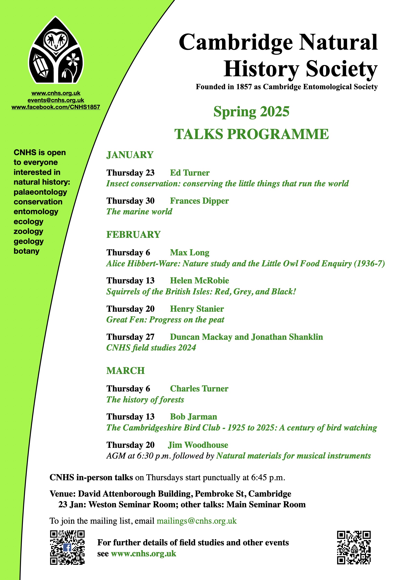 Email list: We have an email list for advance notification of events, which is open to anyone. Simply email cnhs_mailings-join@cnhs.org.uk to be added to the list and follow any instructions you are sent. The list will only be used by the CNHS officers to send emails. You can unsubscribe by emailing cnhs_mailings-leave@cnhs.org.uk